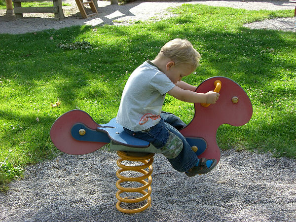 Der Spielplatz befindet sich in ständigem Umbau, aus unserer Sicht ist nicht alles schöner als vorher. Zur Verfügung steht ein Sandspielplatz, eine kleine Rutsche mit Spielhaus, eine Seilbahn und eine große Tunnelrutsche sowie zwei Schaukeln und zwei Schaukeltiere. Die Wippe war beim letzten Besuch verschwunden. Nebenan kann man auf einer Wiese ballspielen. Unter den Geräten sind kleine Steinchen ausgestreut, hier teilweise etwas gefährlich, denn zum einen werden sie gern durch die Tunnelrutsche geschickt, zum anderen sind die Wege zum Teil gefplastert, dann kann man auf den Steinchen ausrutschen. Der Spielplatz ist dank großer Bäume recht schattig, eine Toilette gibt es leider nicht, sodass die Kinder oft die umliegenden Büsche nutzen. Die Tunnelrutsche ist für Kleine zu hoch, für Große oft zu schnell.